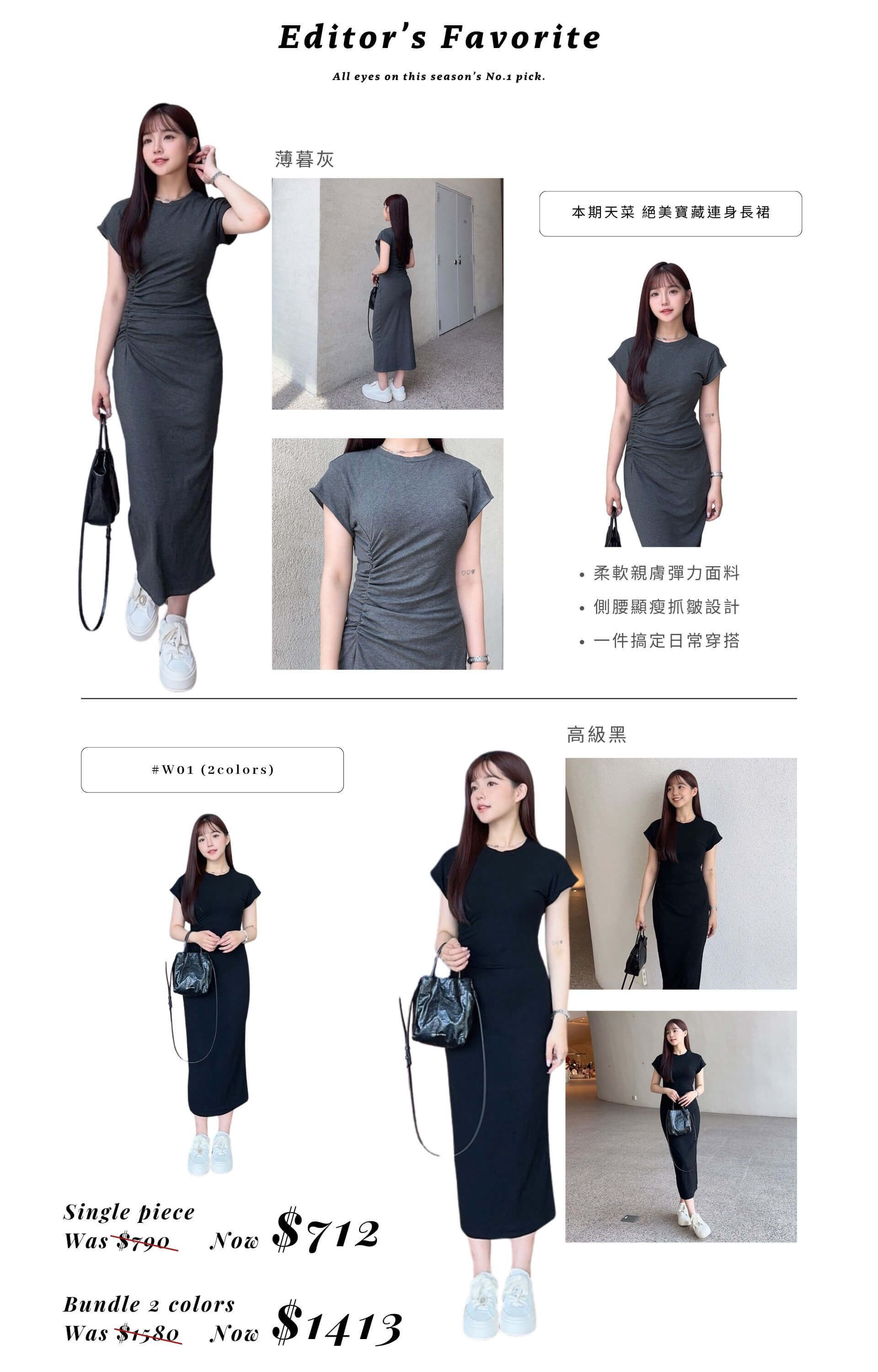 【現貨】本期天菜.ᐟ.ᐟ絕美寶藏腰間抓皺顯瘦連身長裙 (2colors) #W01