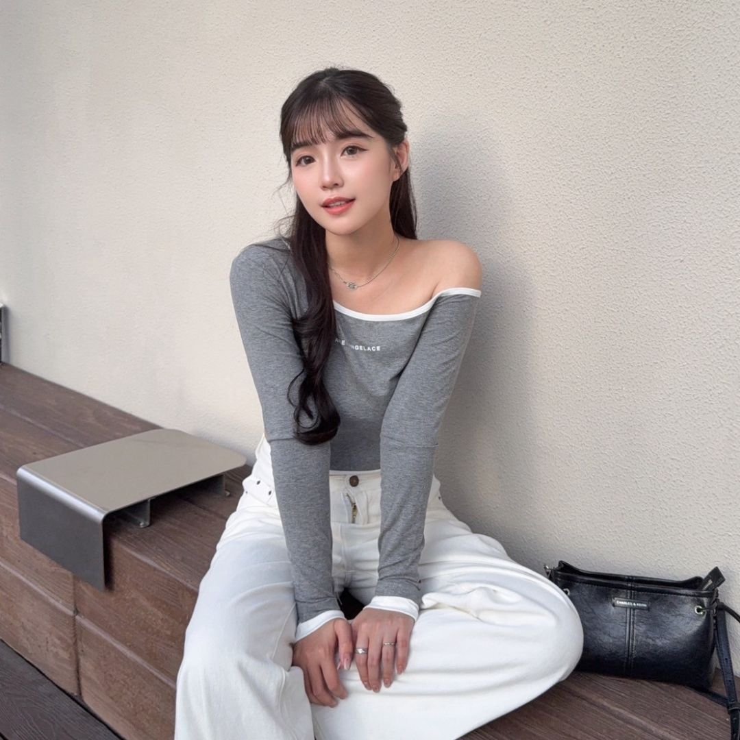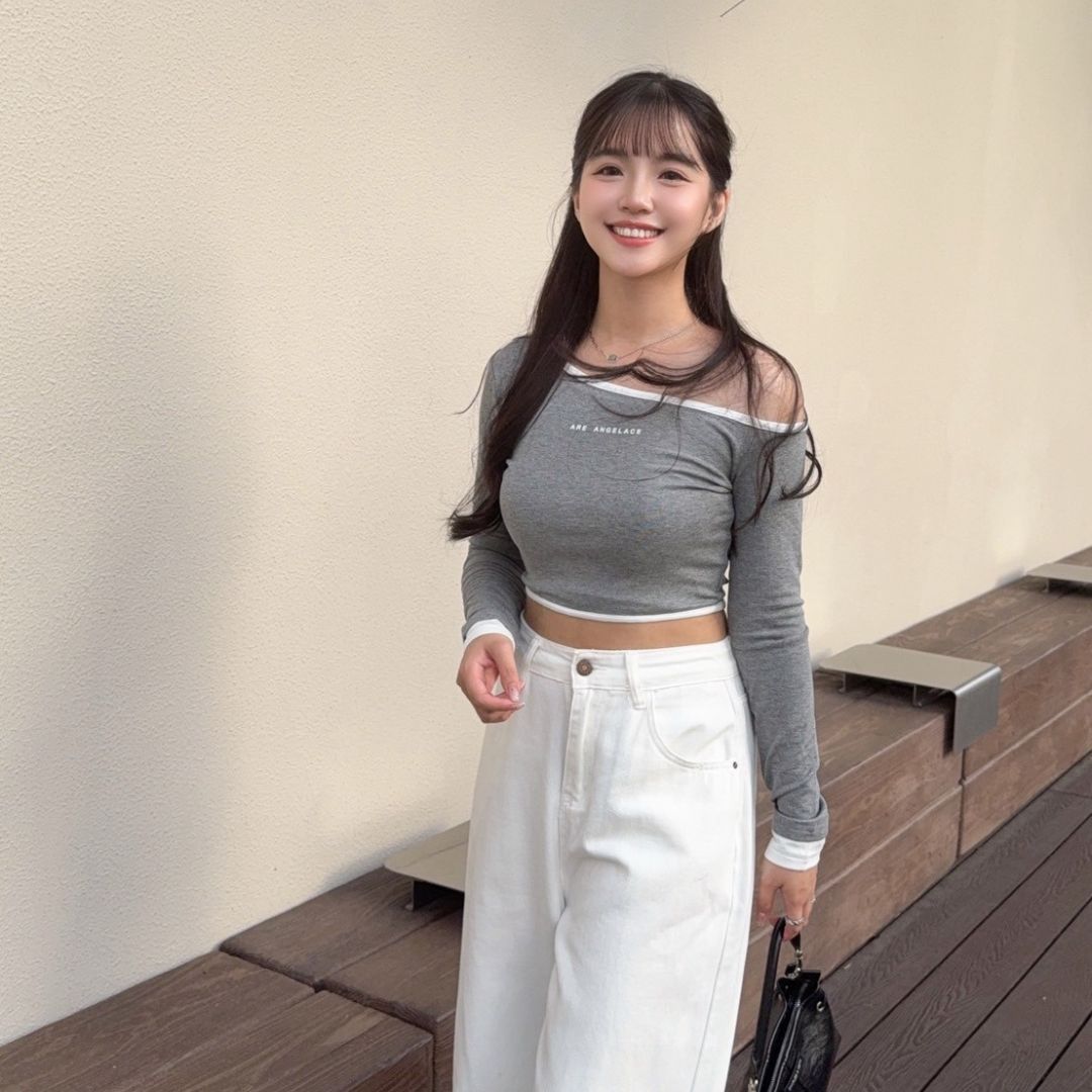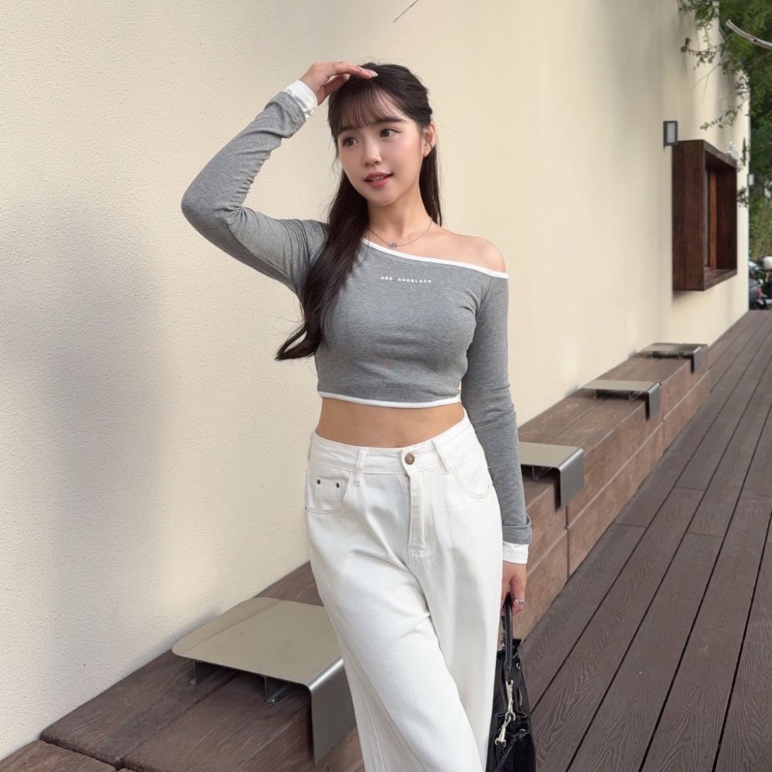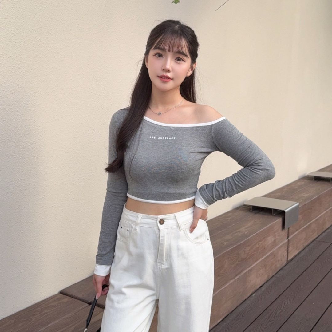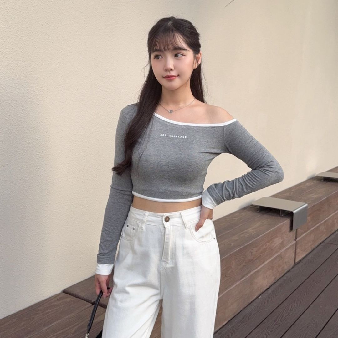 先自留了.ᐟ.ᐟ女團風滾邊斜肩長袖短版上衣 (1colors) #Z03