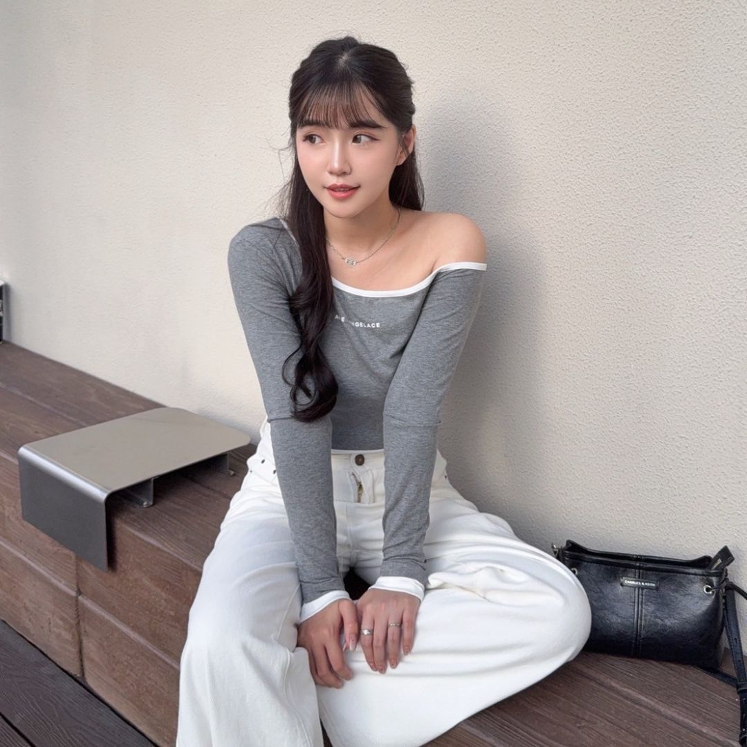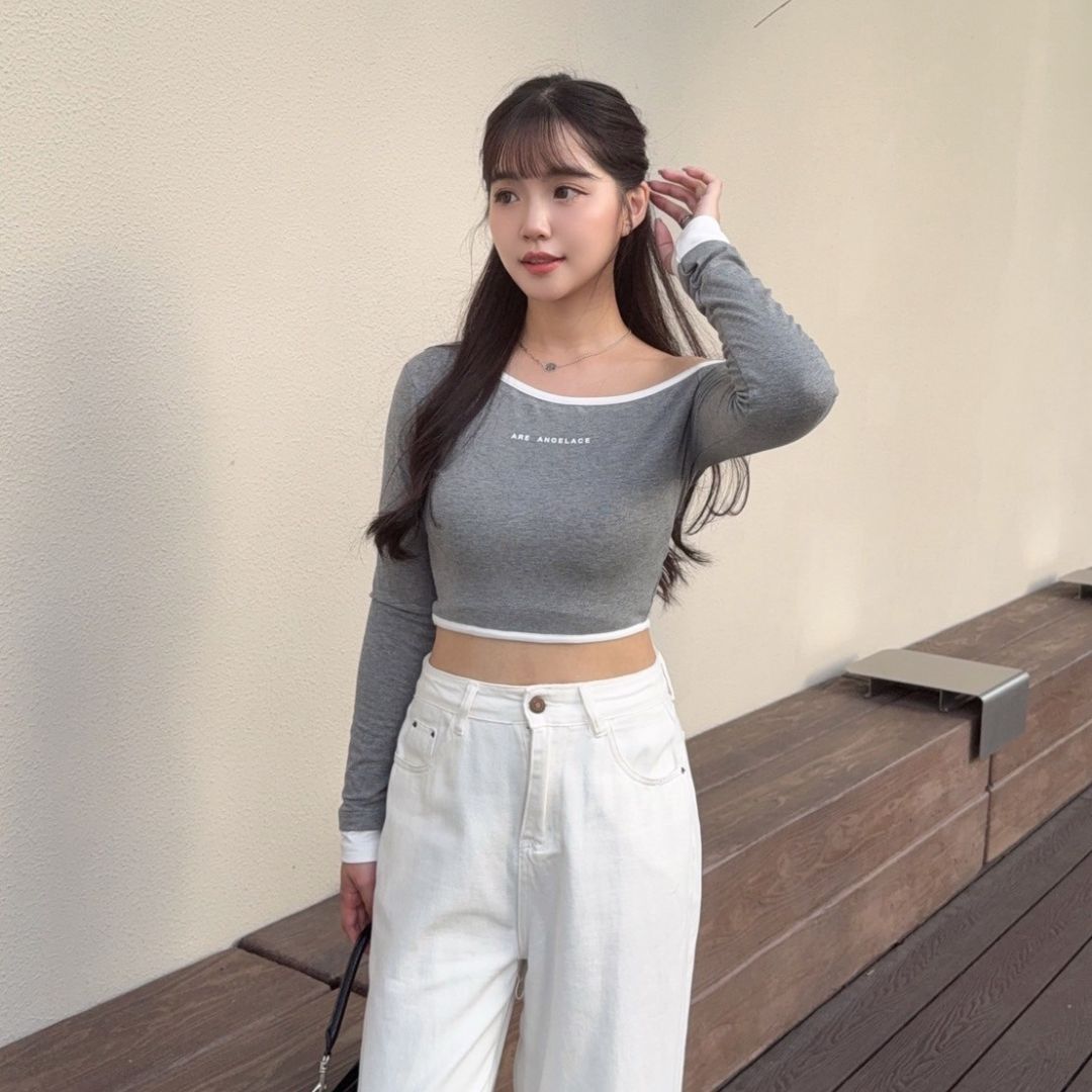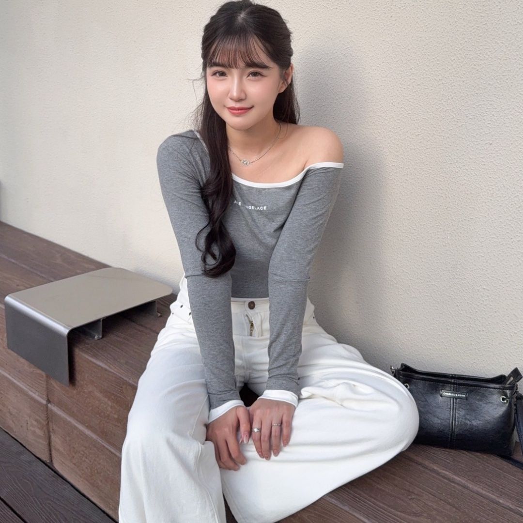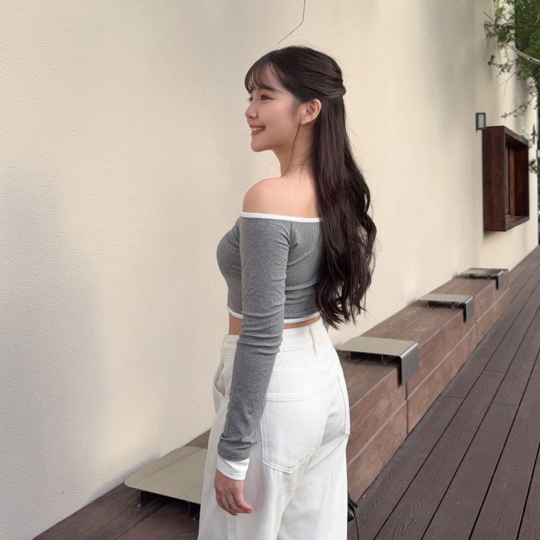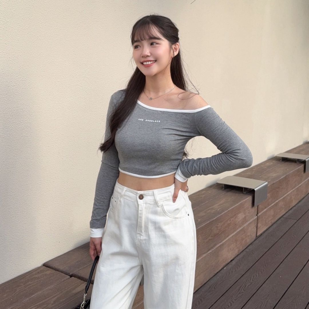 先自留了.ᐟ.ᐟ女團風滾邊斜肩長袖短版上衣 (1colors) #Z03