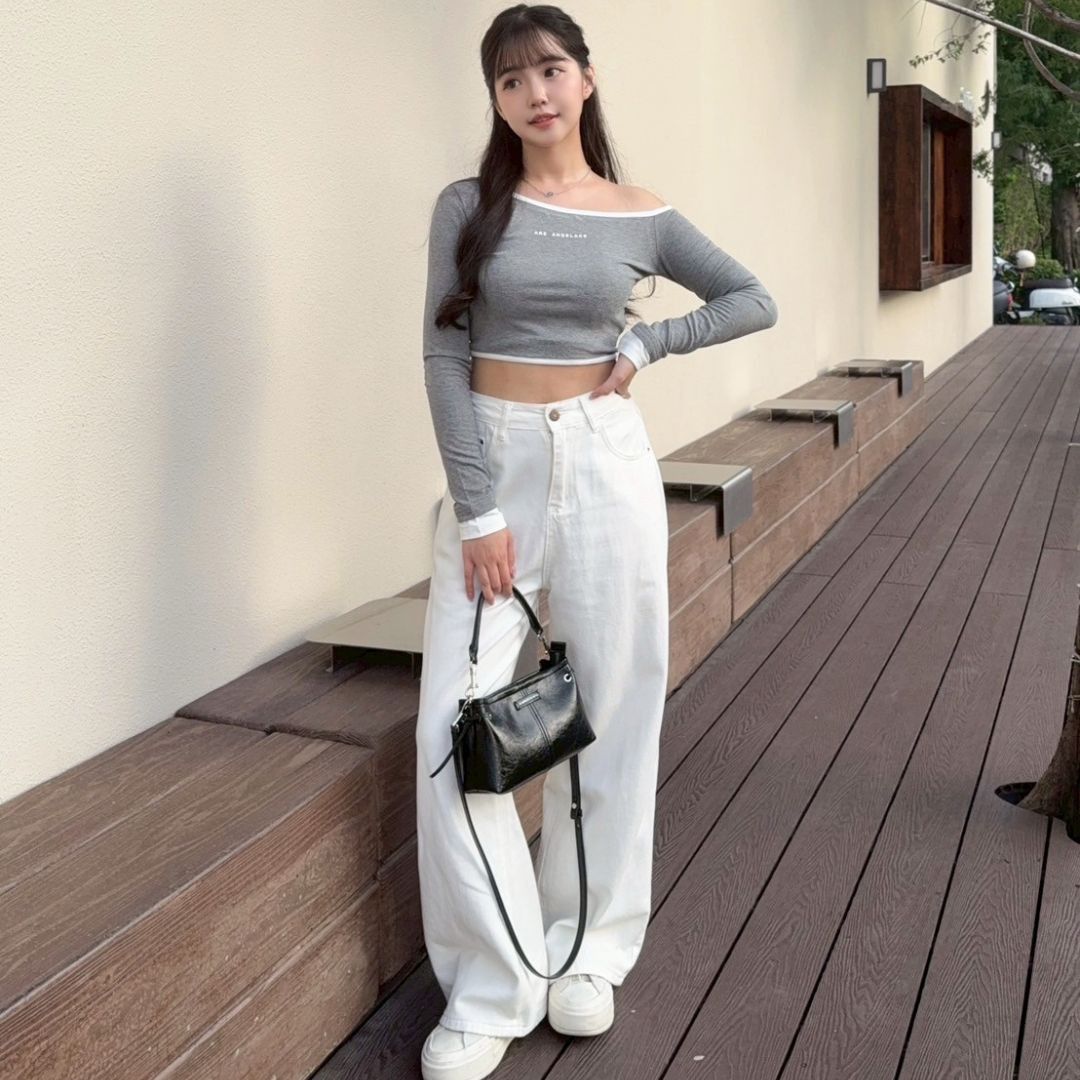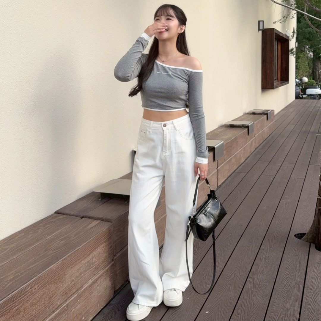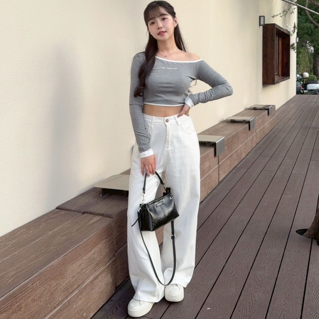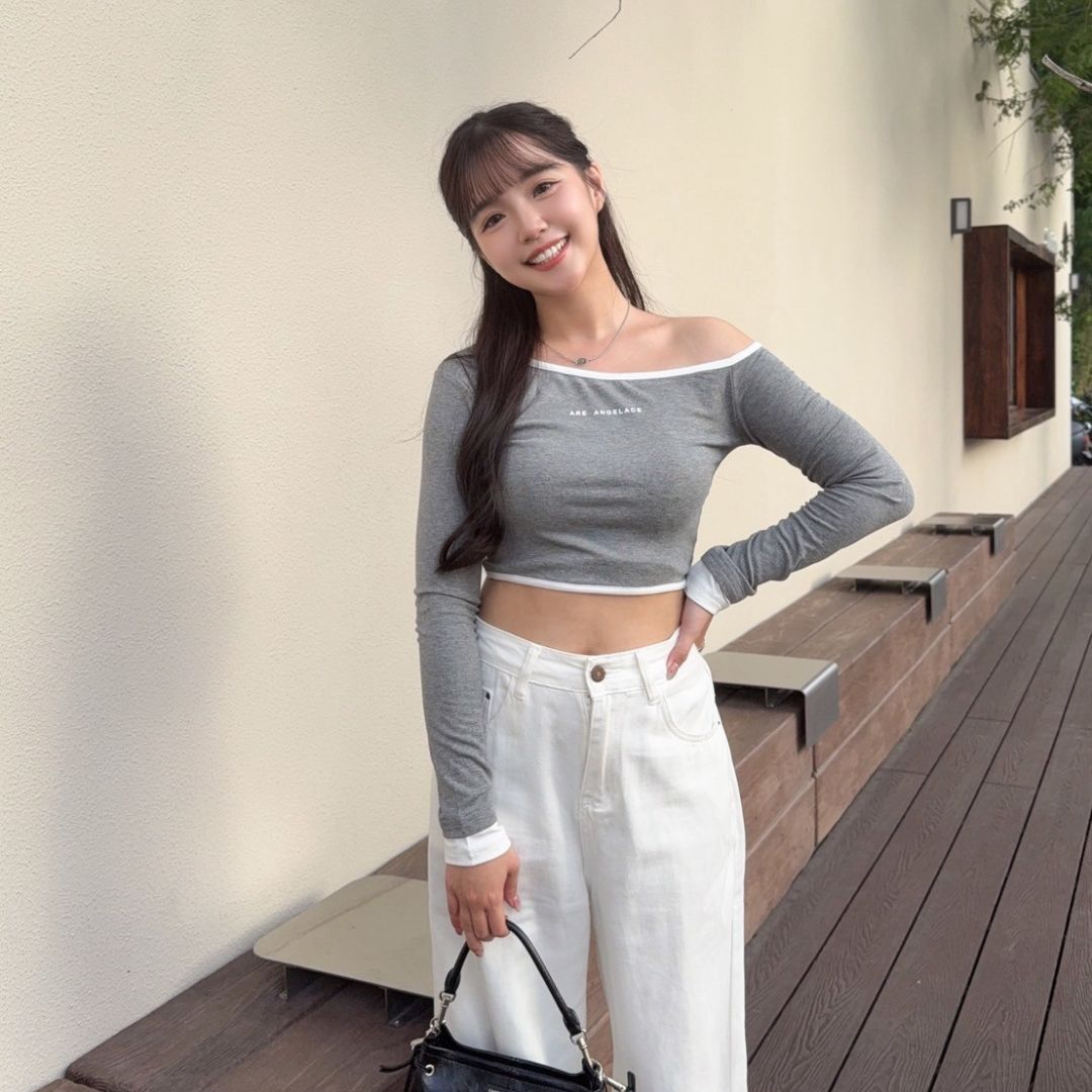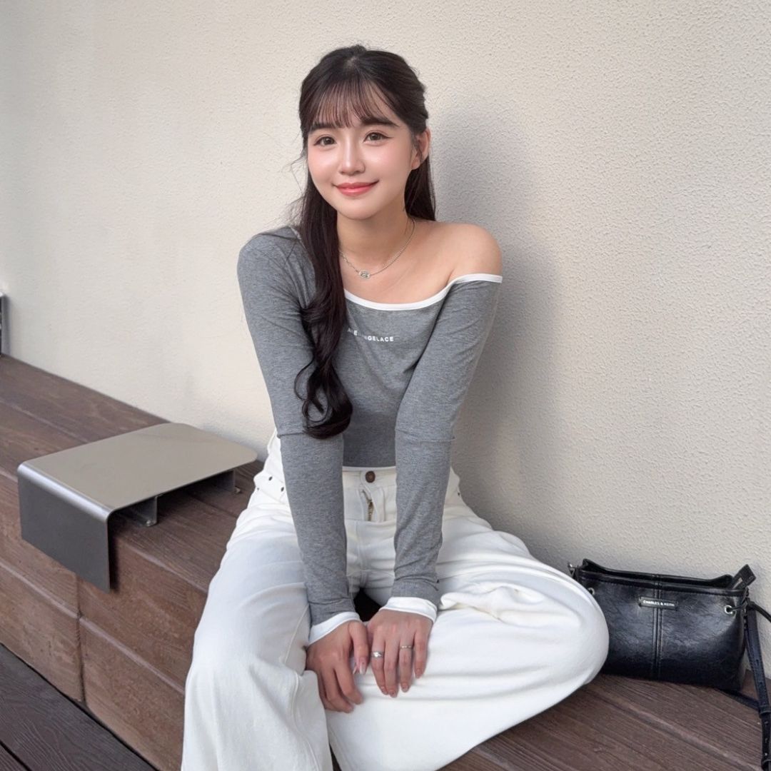 先自留了.ᐟ.ᐟ女團風滾邊斜肩長袖短版上衣 (1colors) #Z03