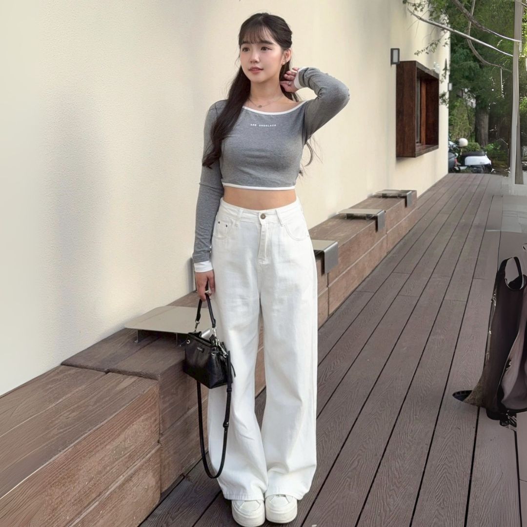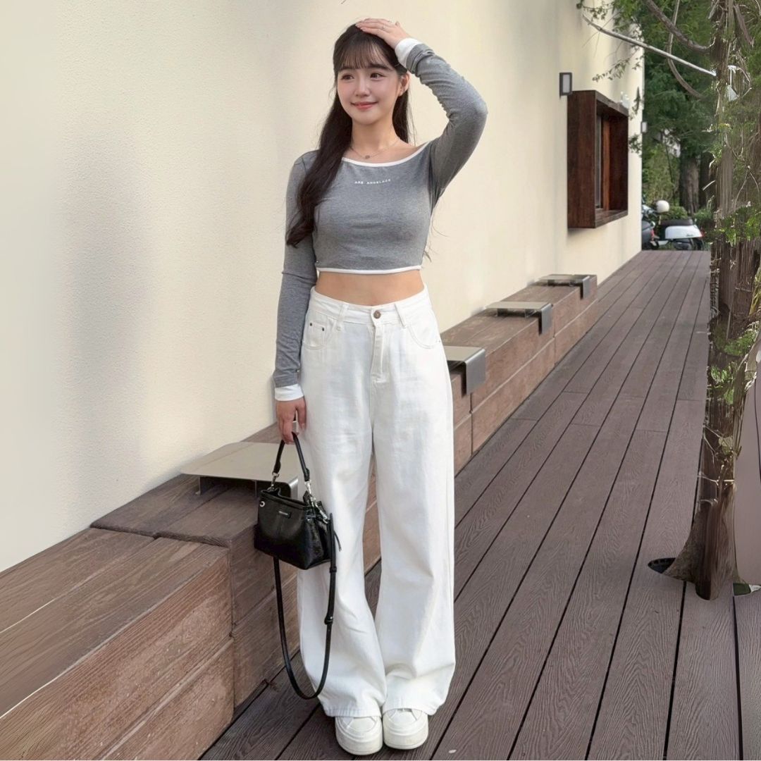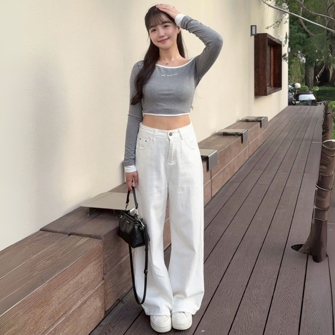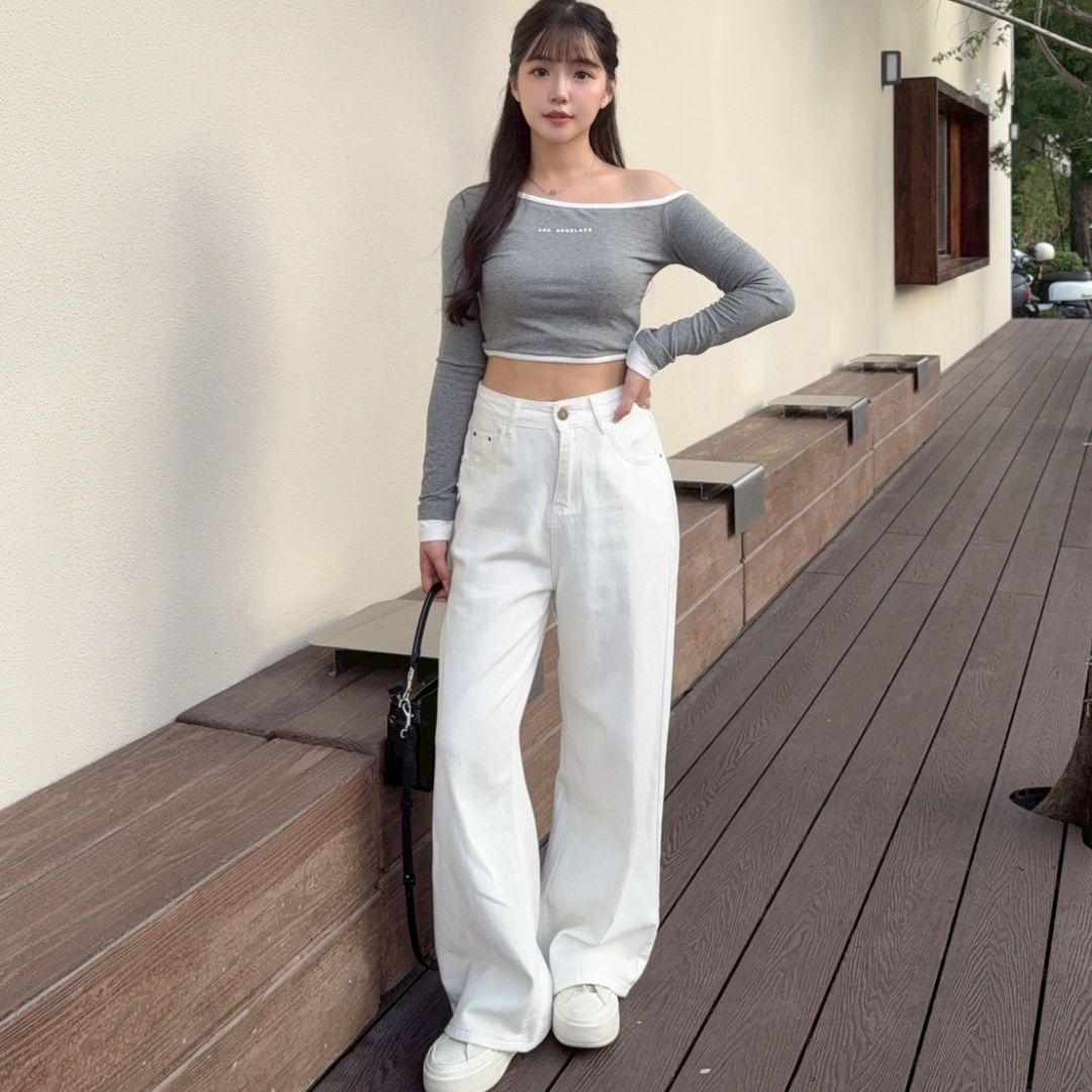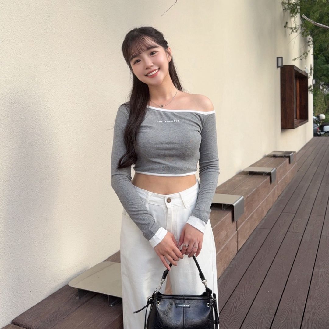先自留了.ᐟ.ᐟ女團風滾邊斜肩長袖短版上衣 (1colors) #Z03