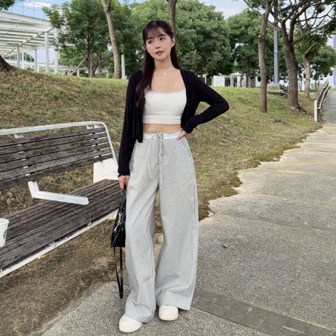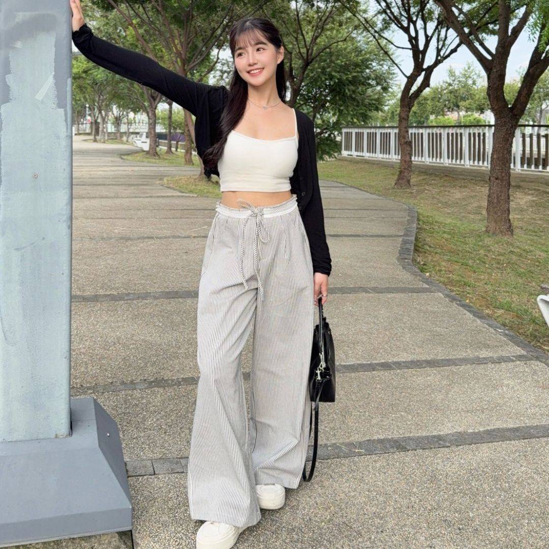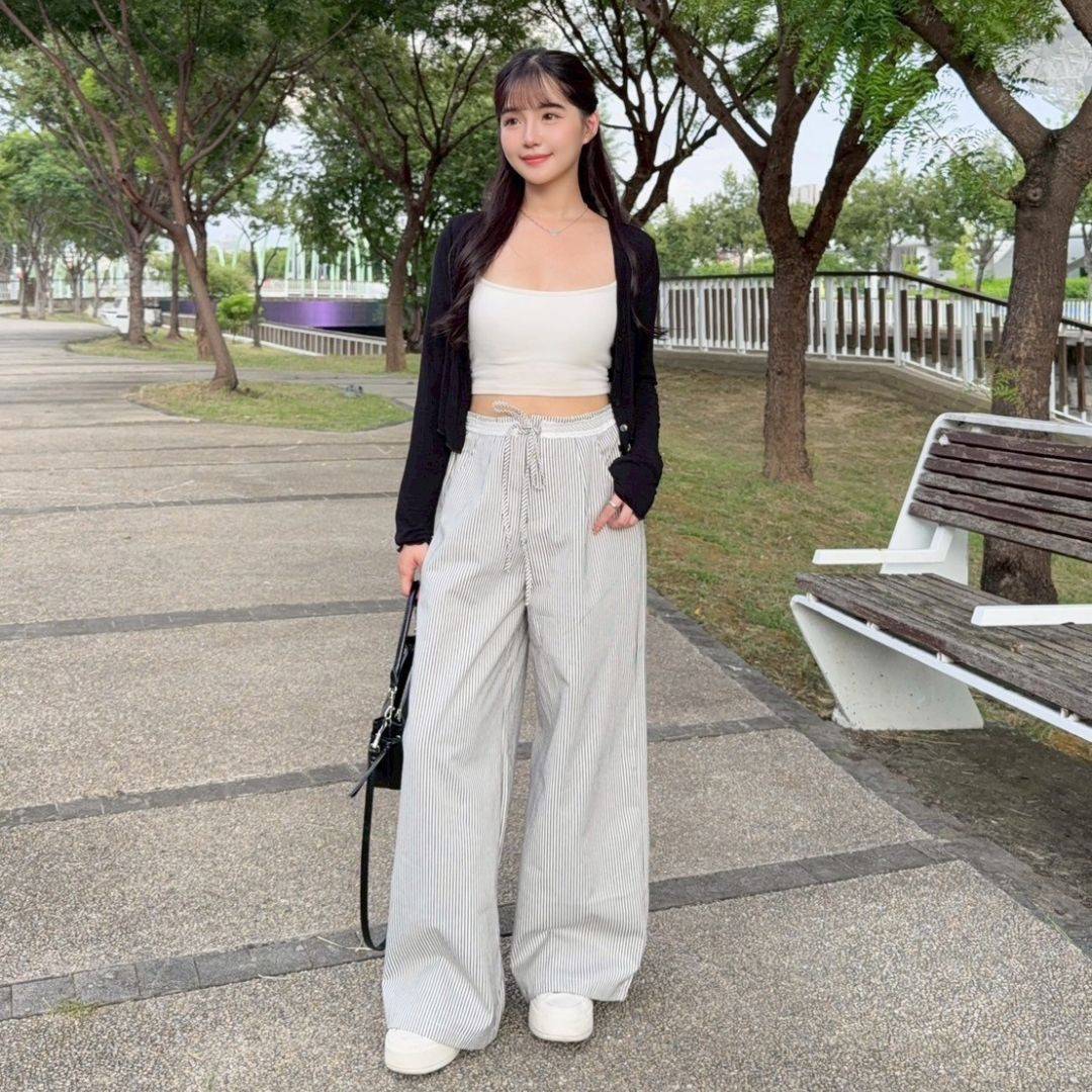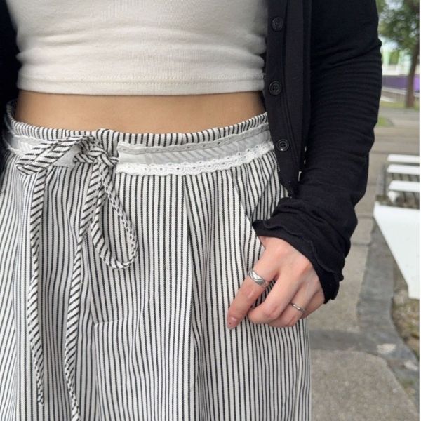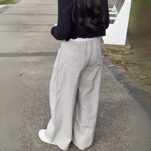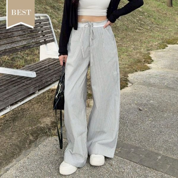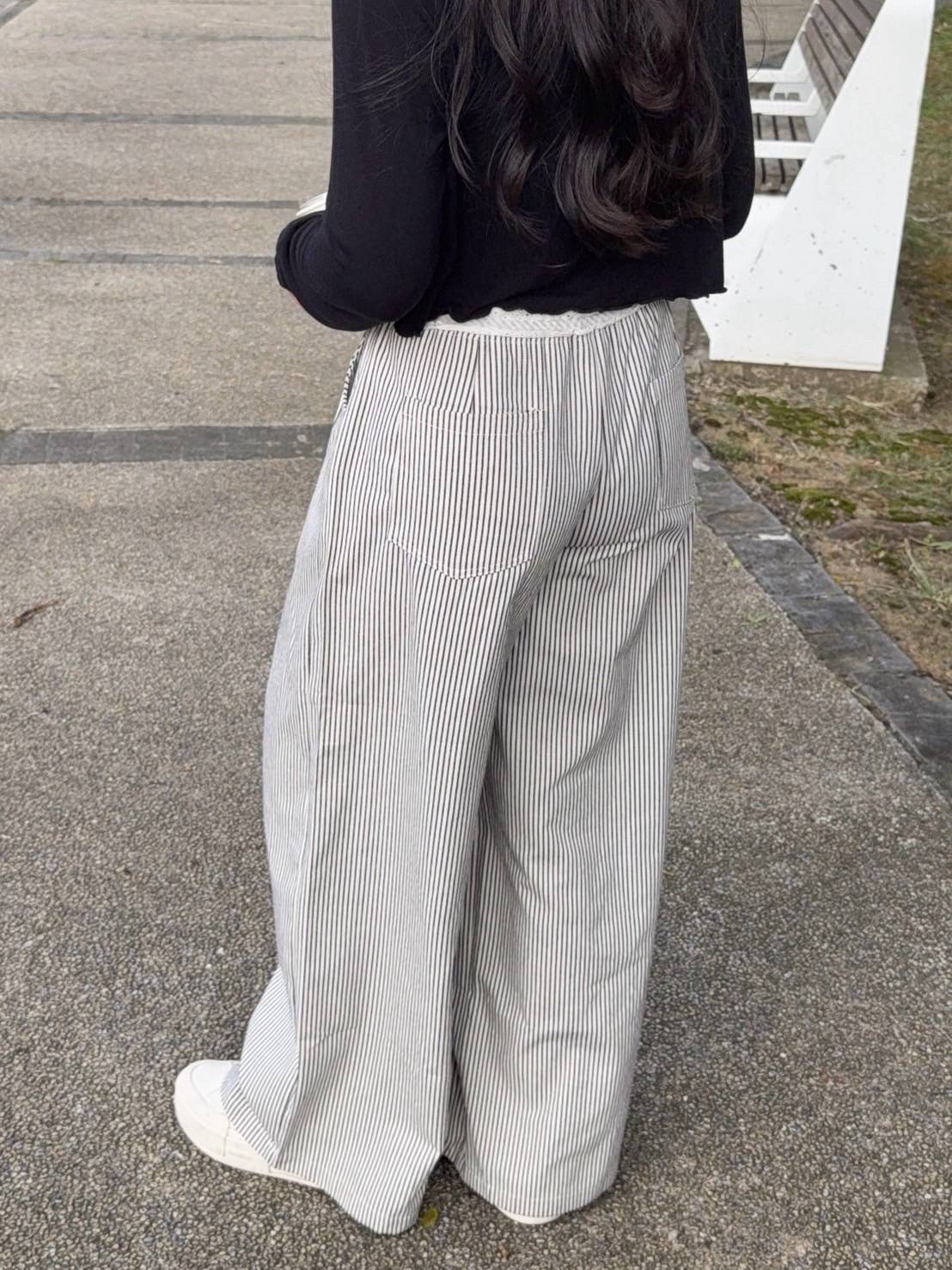 鬆弛感的神 挺版腰間蕾絲綁帶條纹寬褲 (1colors) #Z09