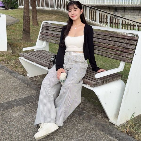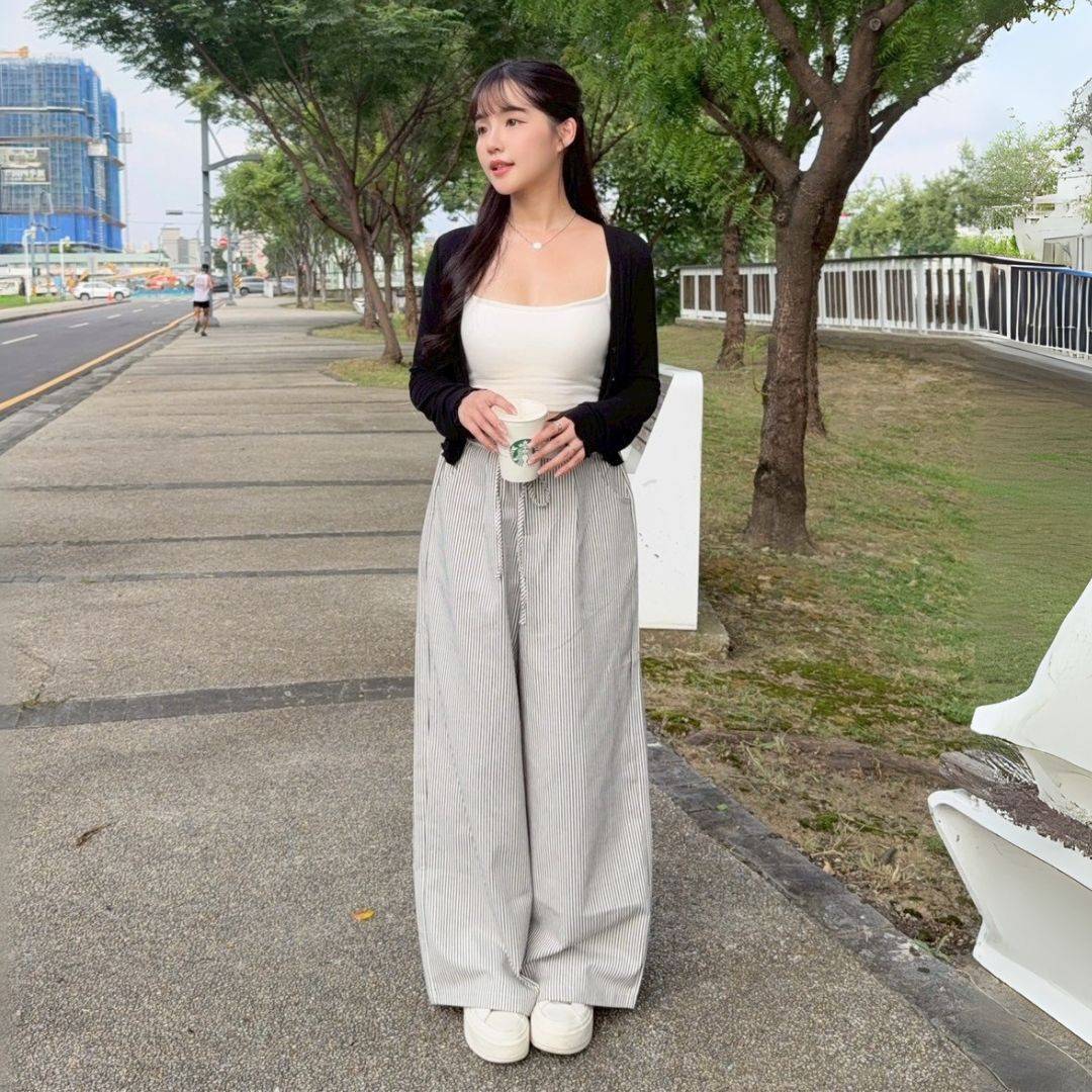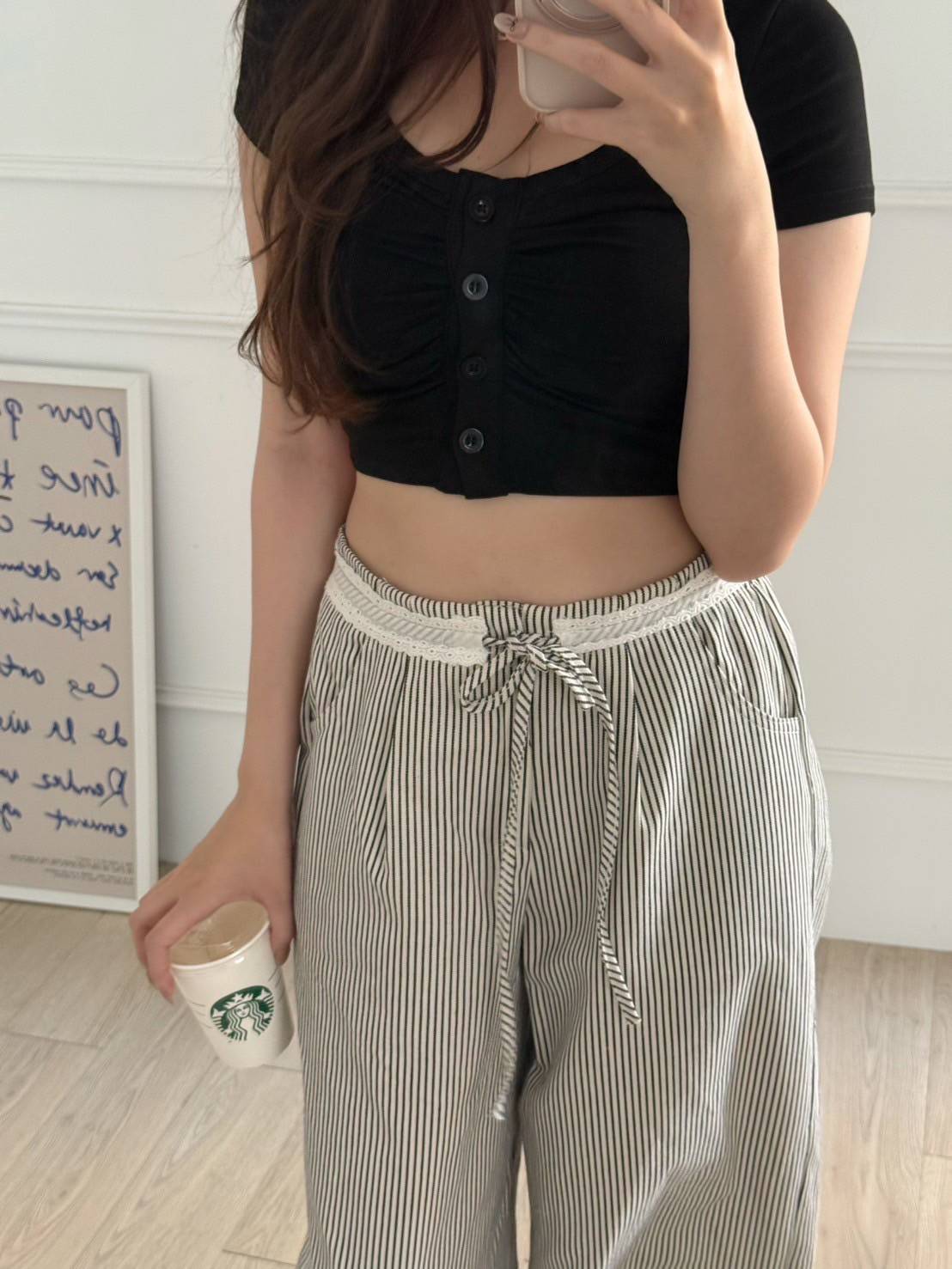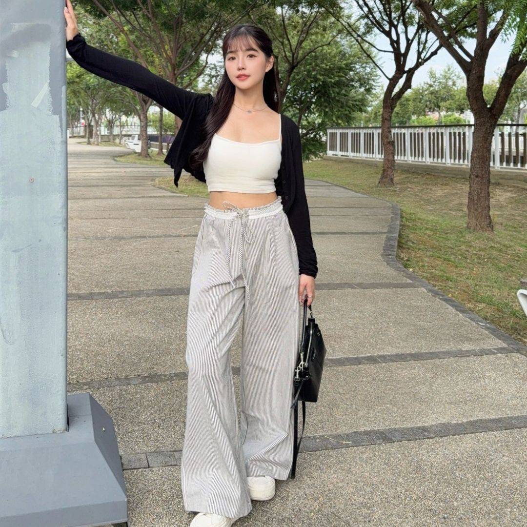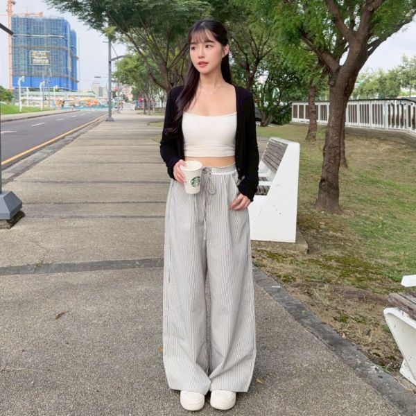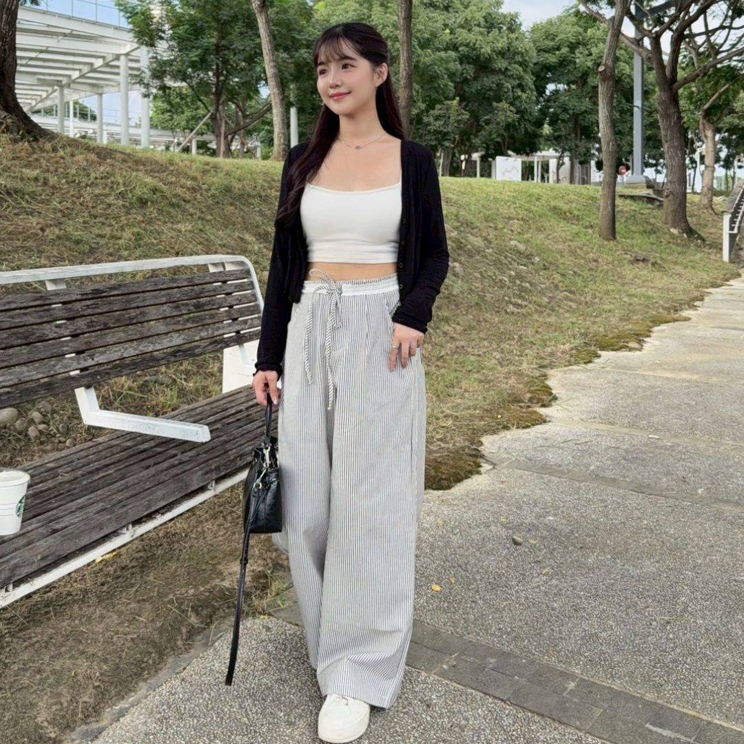 鬆弛感的神 挺版腰間蕾絲綁帶條纹寬褲 (1colors) #Z09
