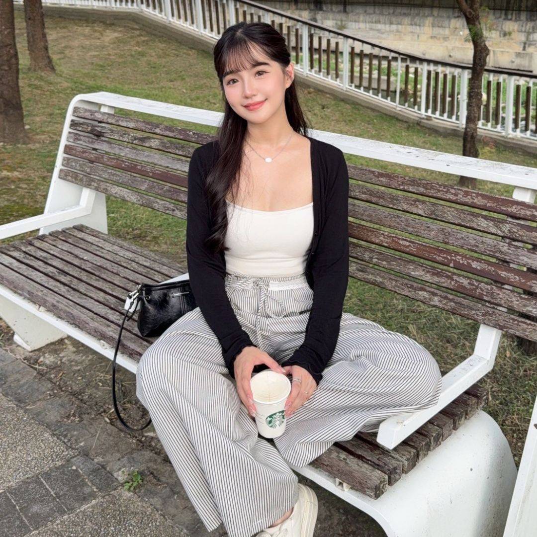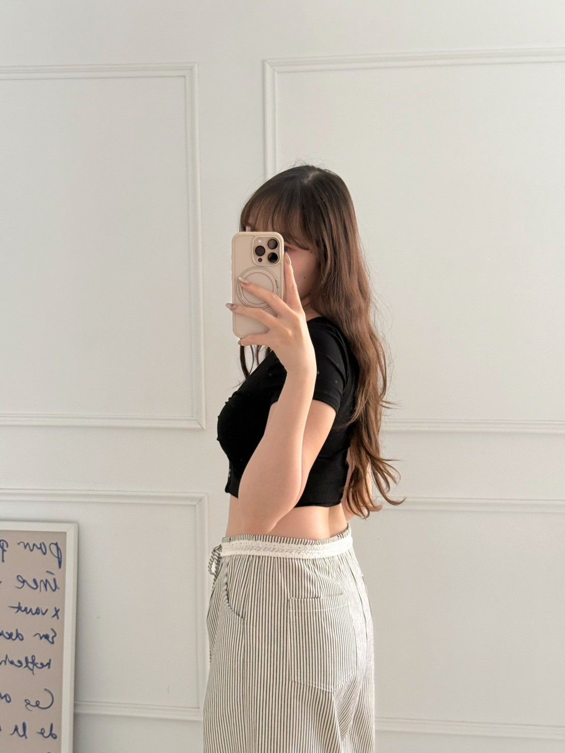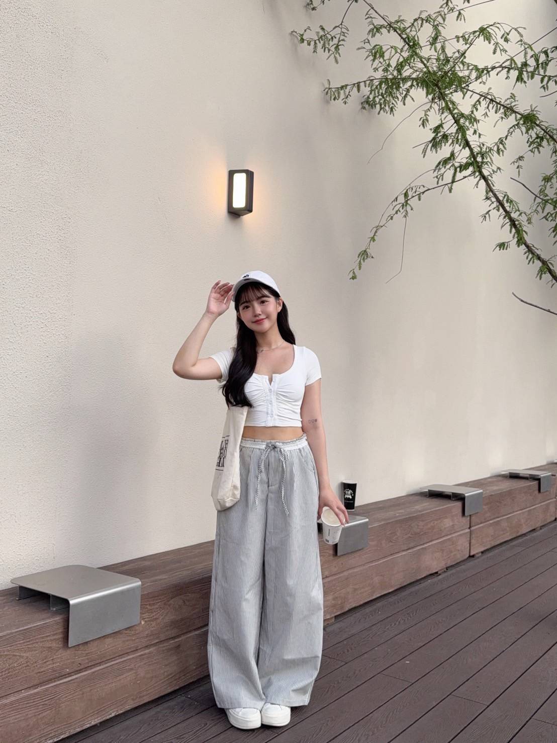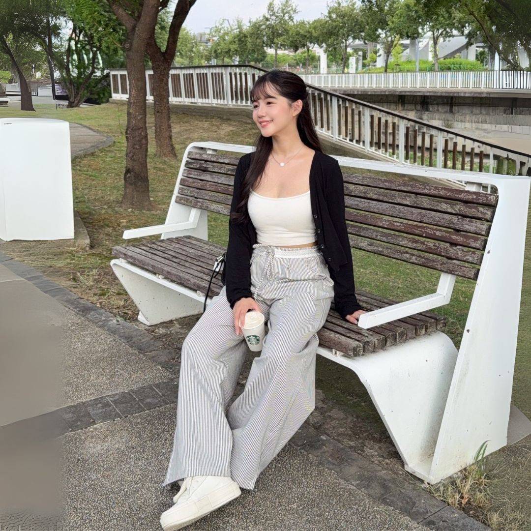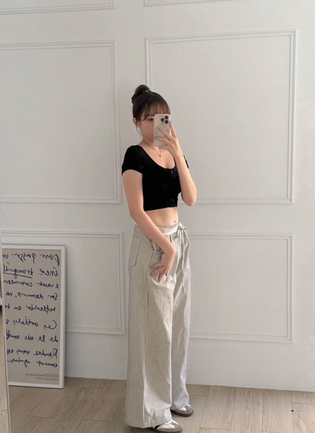 鬆弛感的神 挺版腰間蕾絲綁帶條纹寬褲 (1colors) #Z09