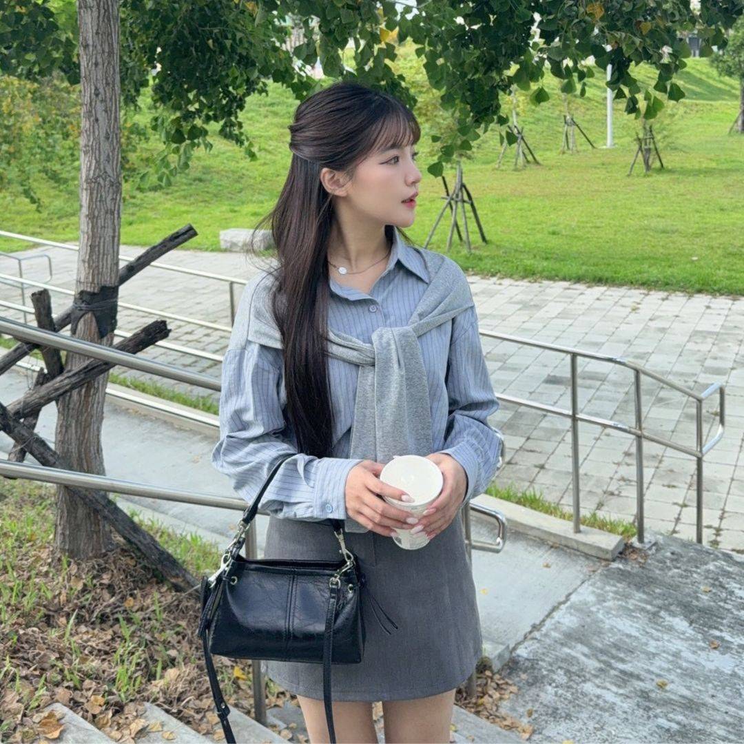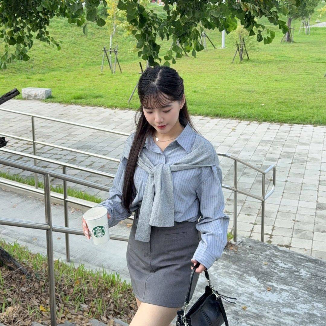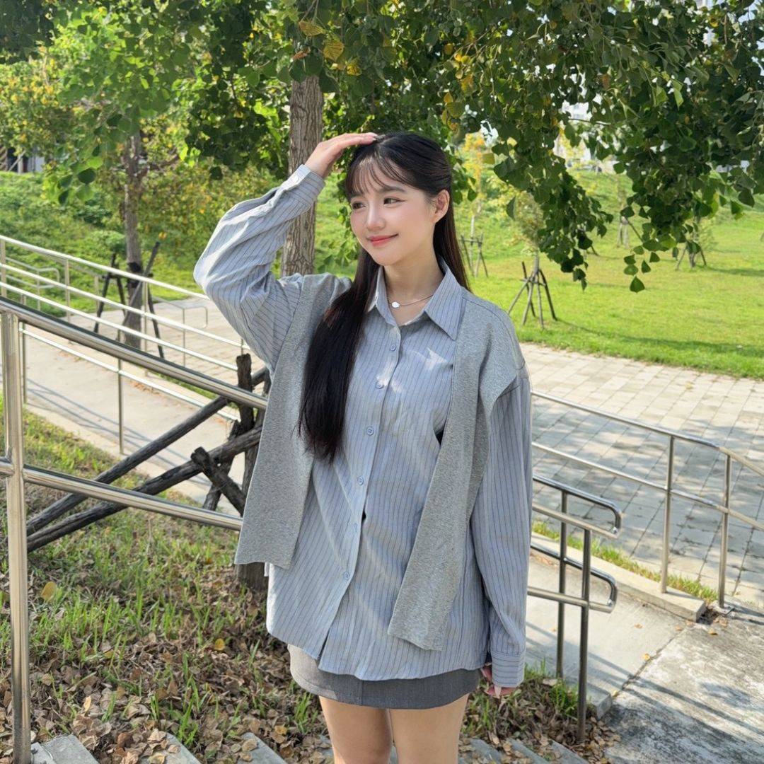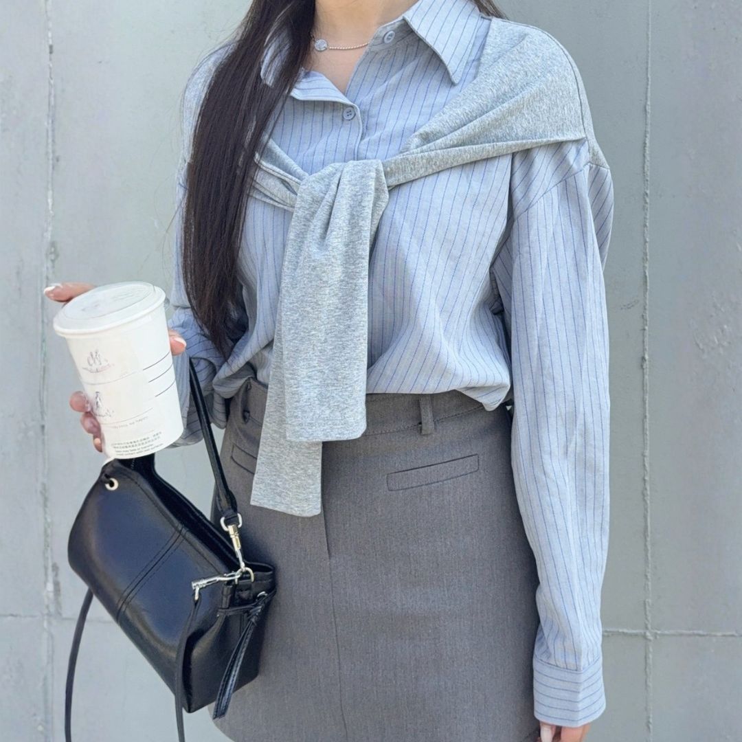 【貨在途中】轟動校園 一眼愛上不易皺假兩件披肩條紋襯衫 (1colors) #ZA07