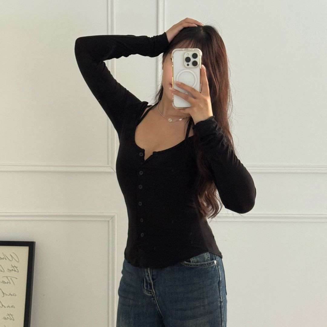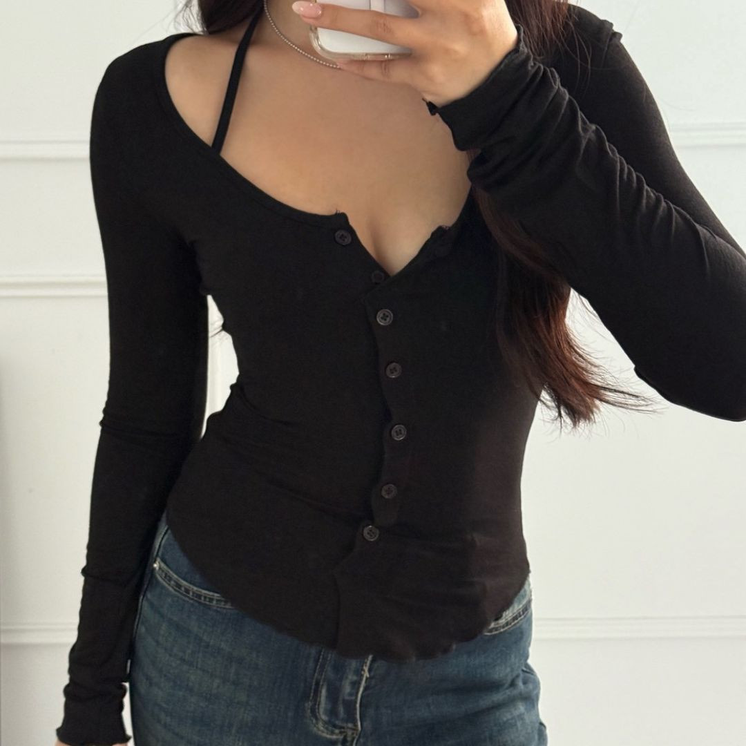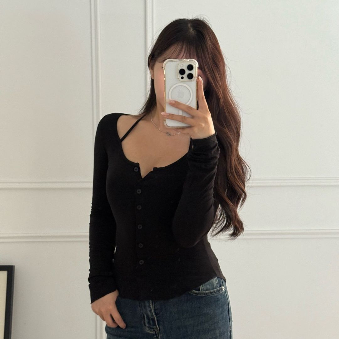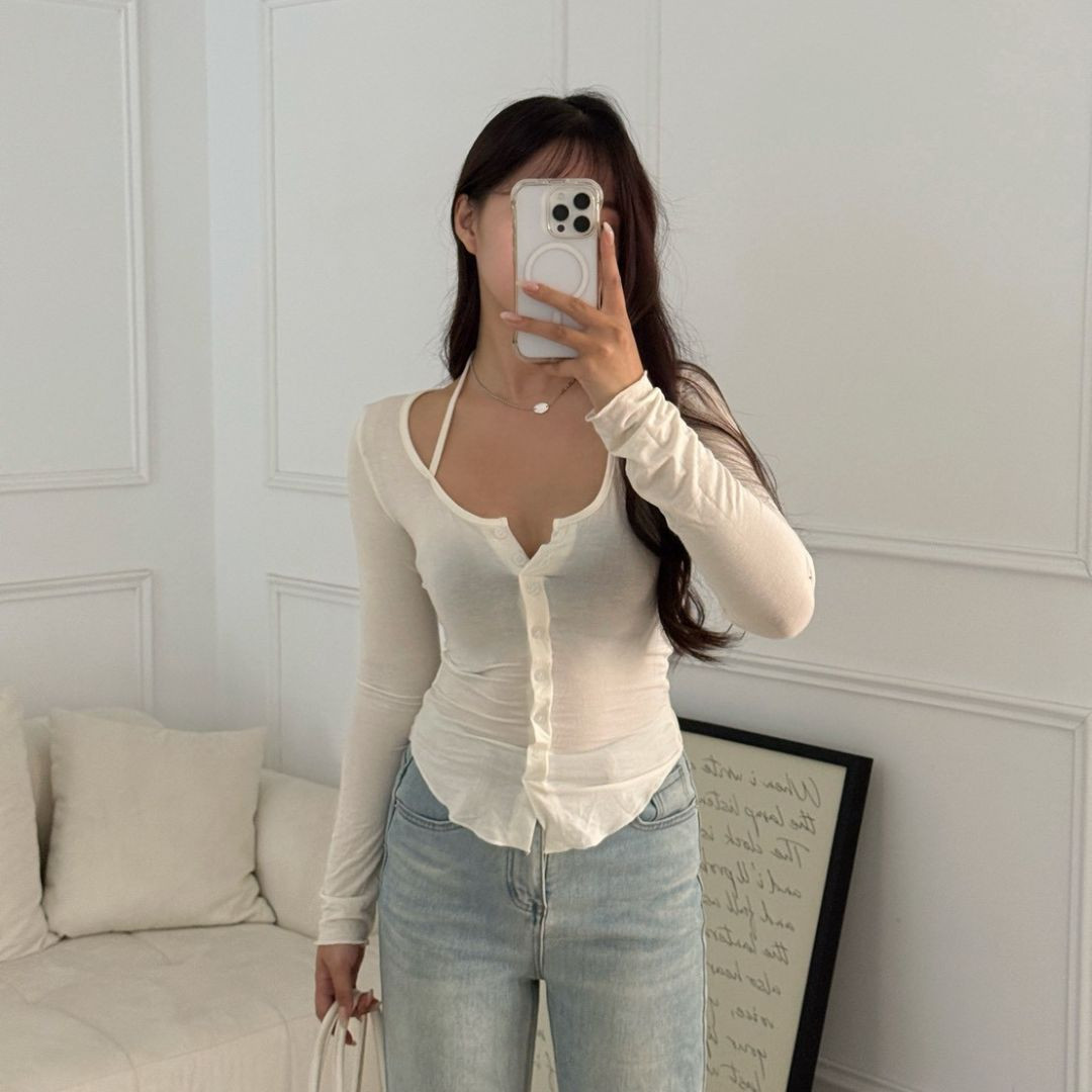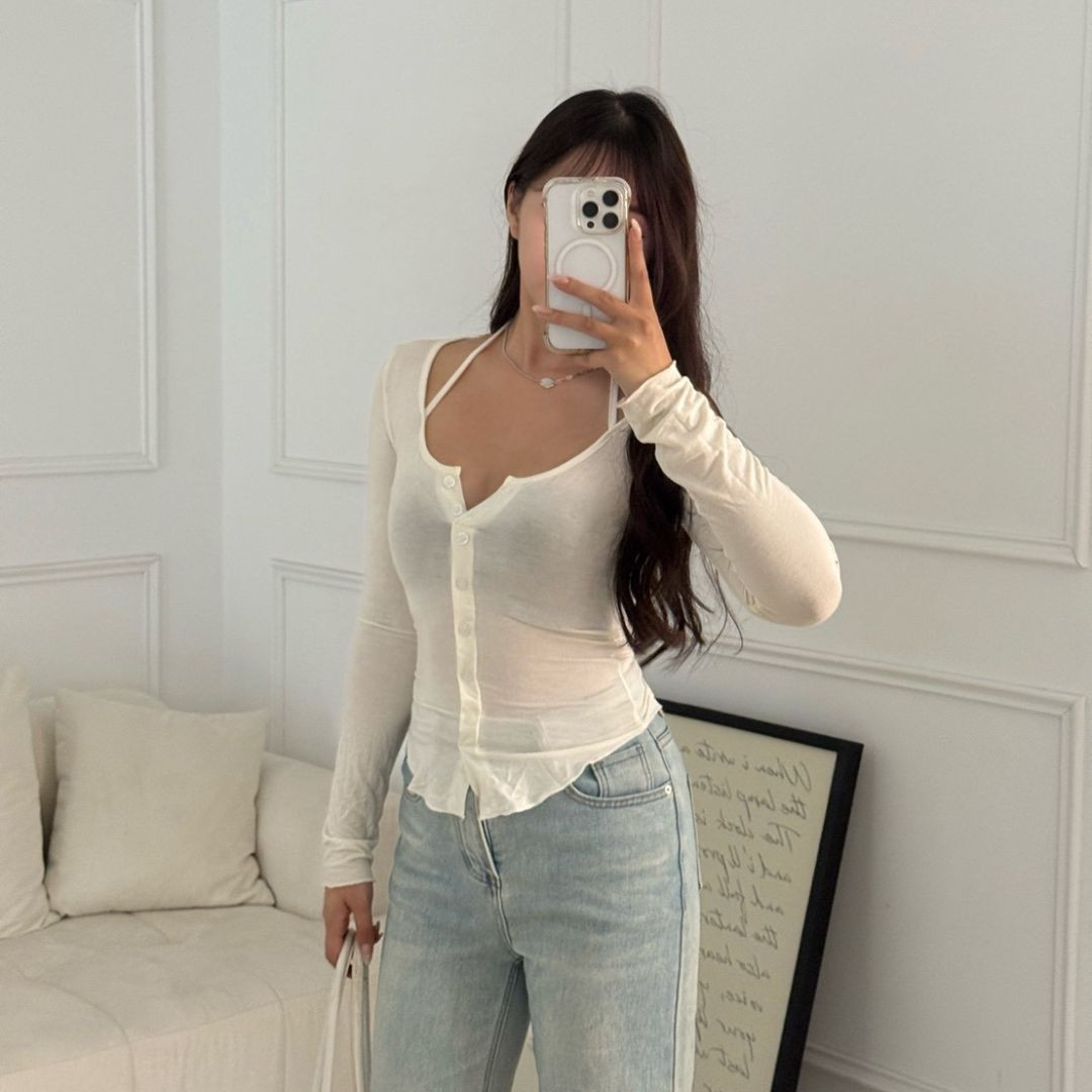 魅力吸引 心機掛脖綁帶排釦薄長袖上衣 (3colors) #ZB06