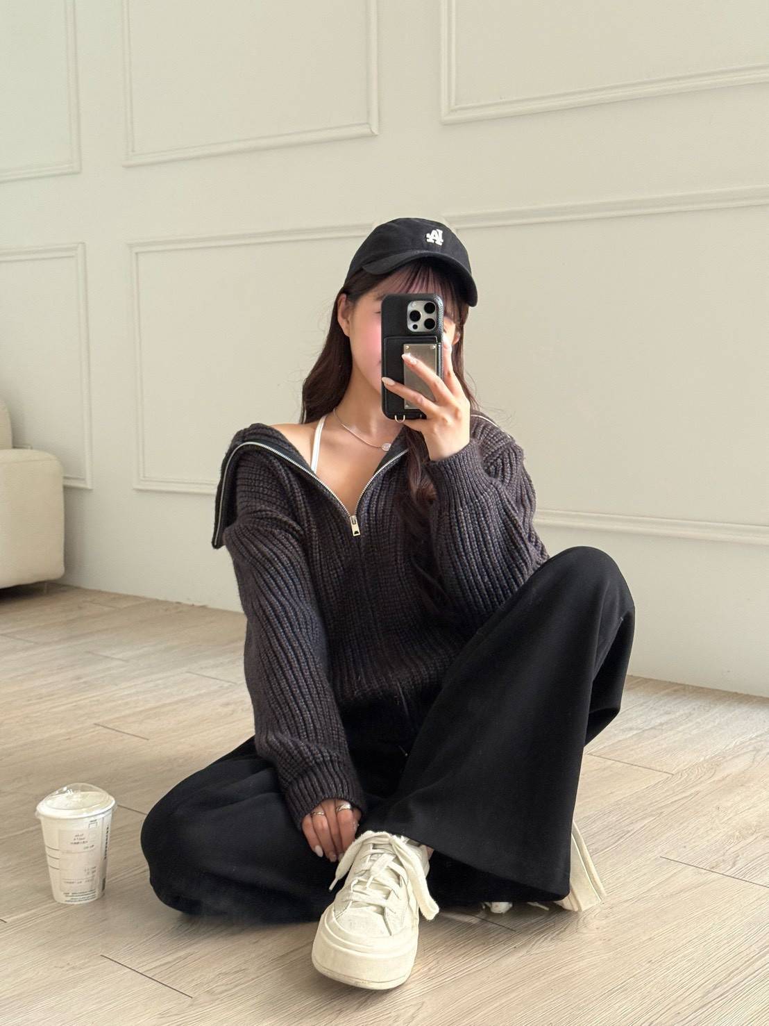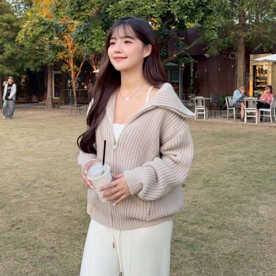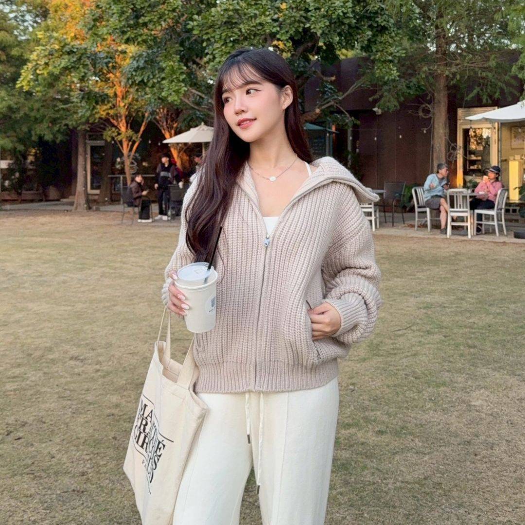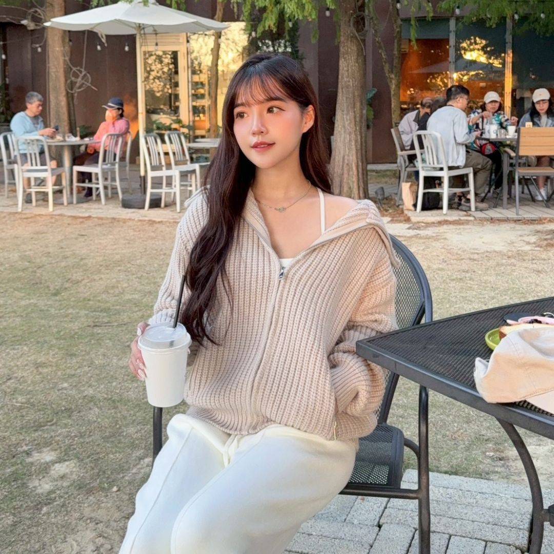 韓女輪廓 厚磅翻領拉鏈口袋毛衣 (2colors) #ZE05